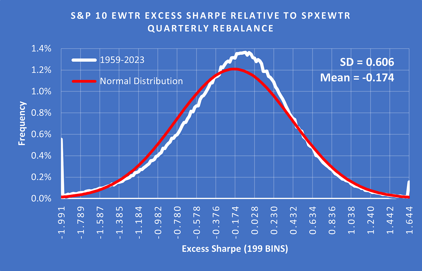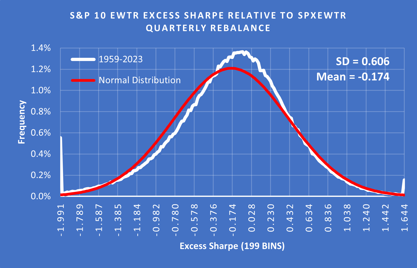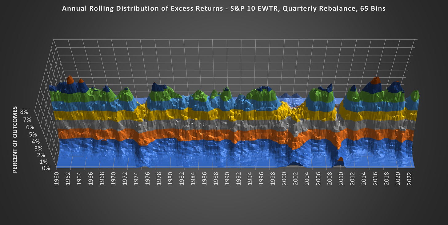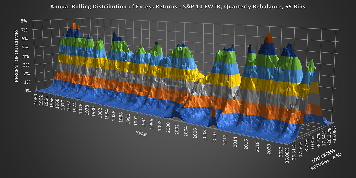 (Above) This is the probability distribution of excess returns for the S&P 10 EWTR rebalanced quarterly, 1957 - 2023. The Standard Deviation (SD) of 8.77% means that in a normal distribution, roughly 68.2% of the time, through pure luck you can expect outcomes +/- 8.77% relative to the benchmark in any given year. The X-Axis covers 3 SD.