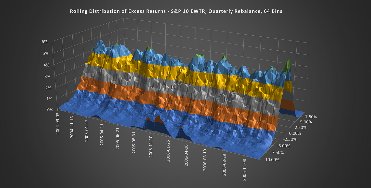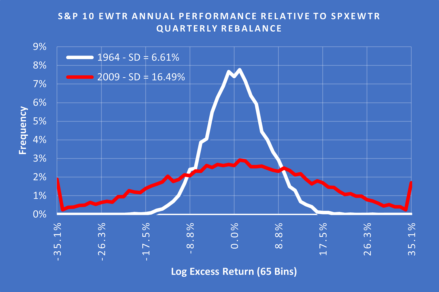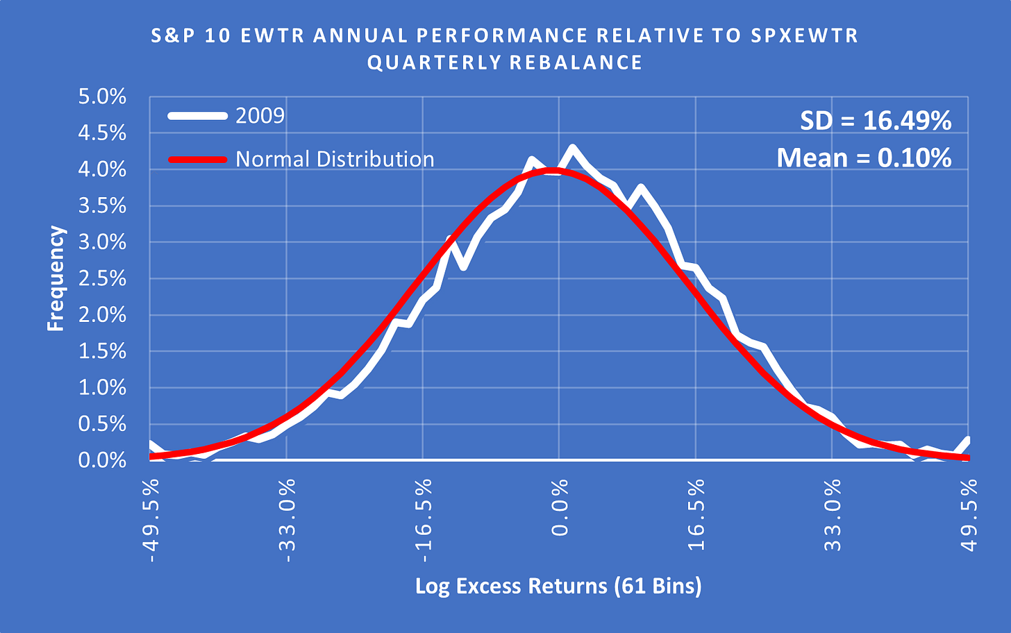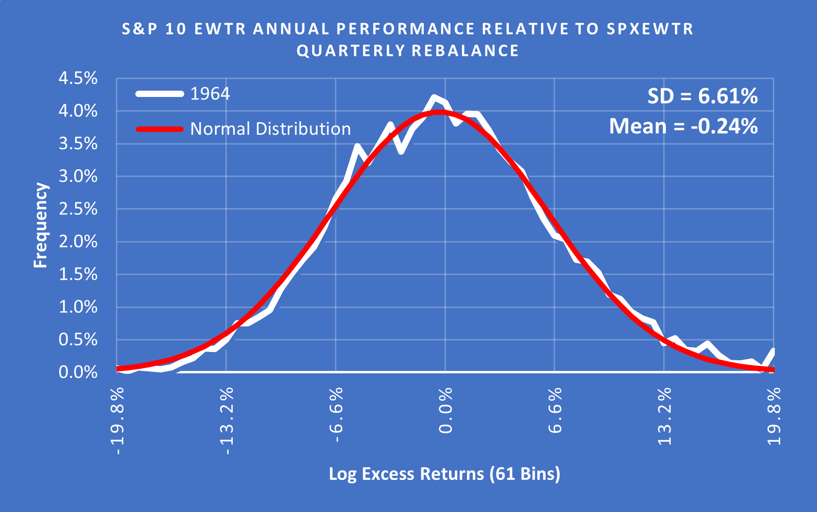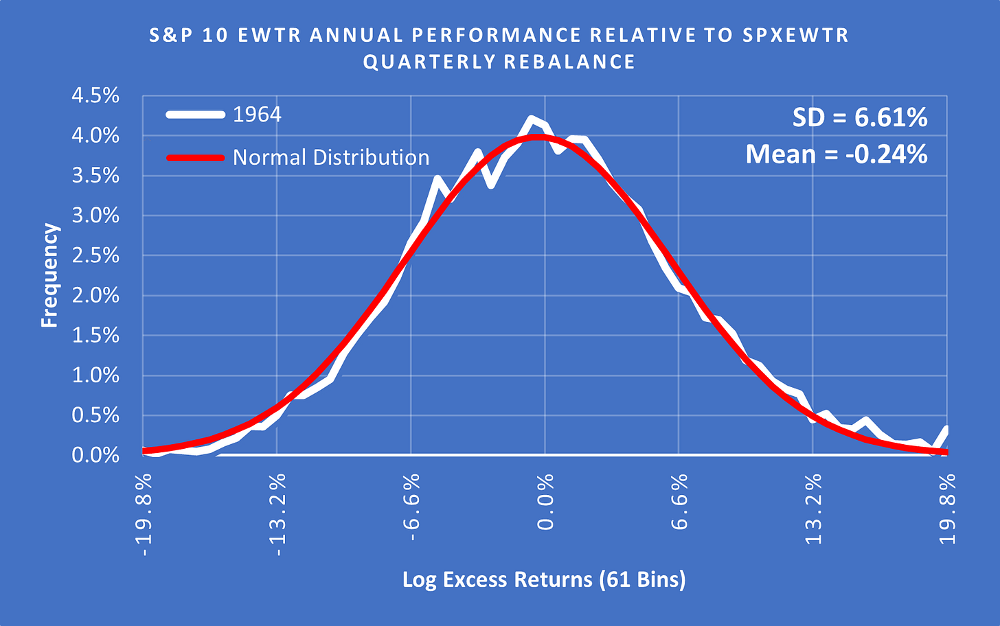 (Above) This is the probability distribution of excess returns for the S&P 10 EWTR rebalanced quarterly, 1957 - 2023. The Standard Deviation (SD) of 8.77% means that in a normal distribution, roughly 68.2% of the time, through pure luck you can expect outcomes +/- 8.77% relative to the benchmark in any given year. The X-Axis covers 3 SD.