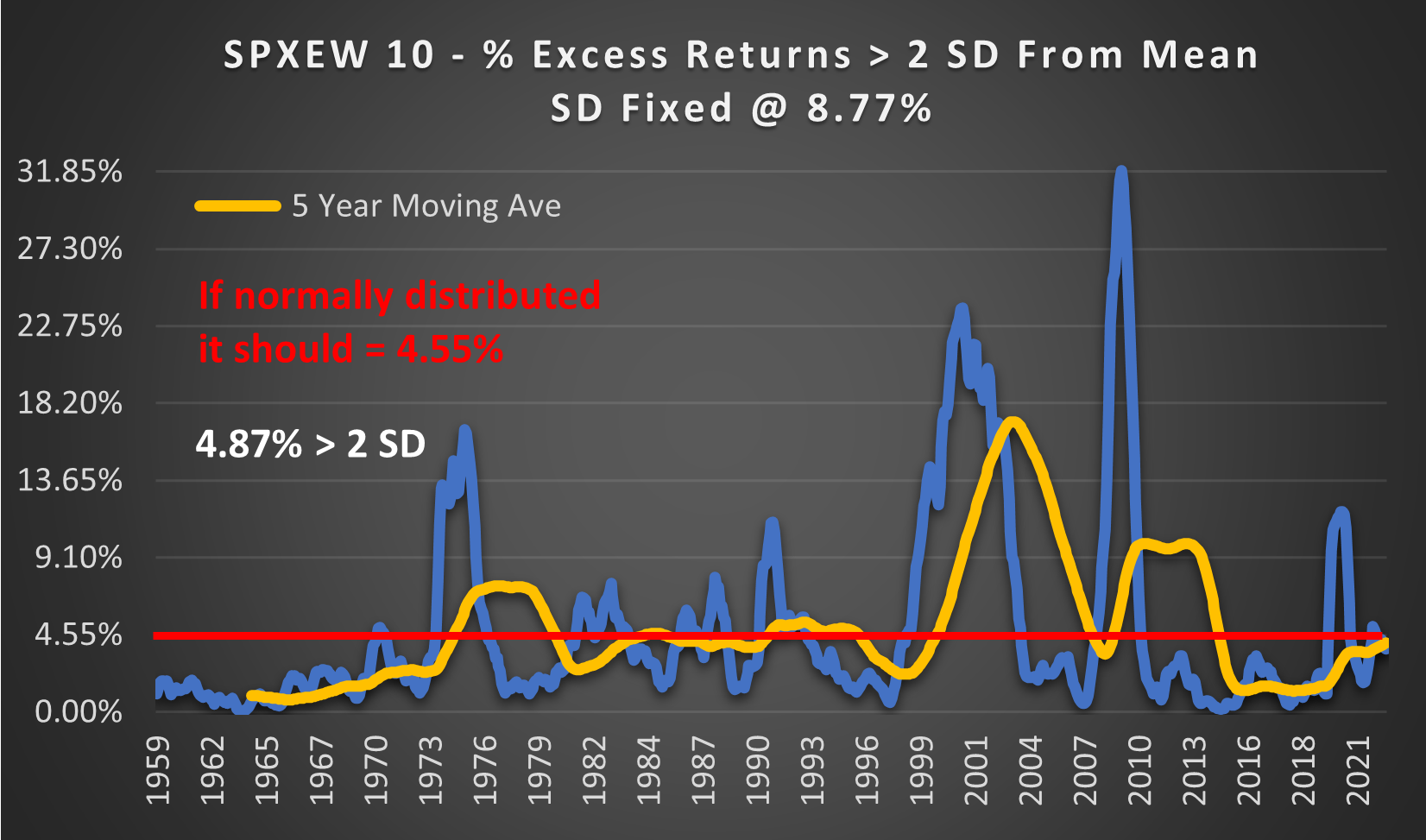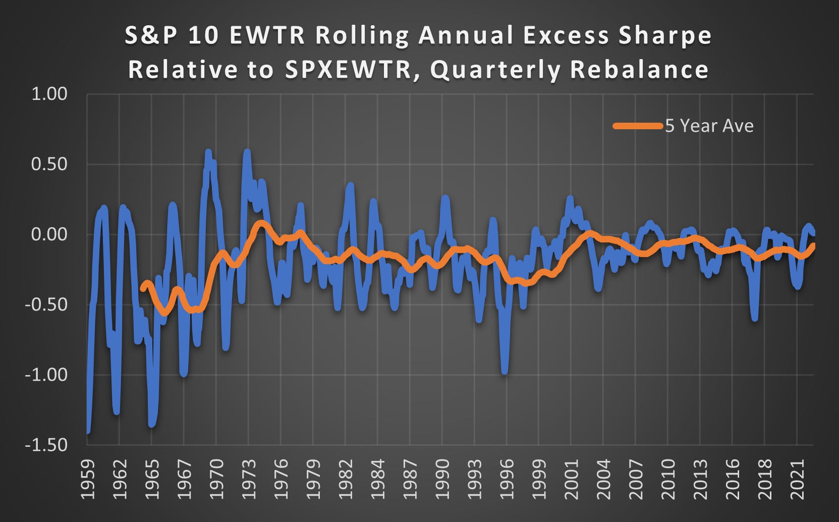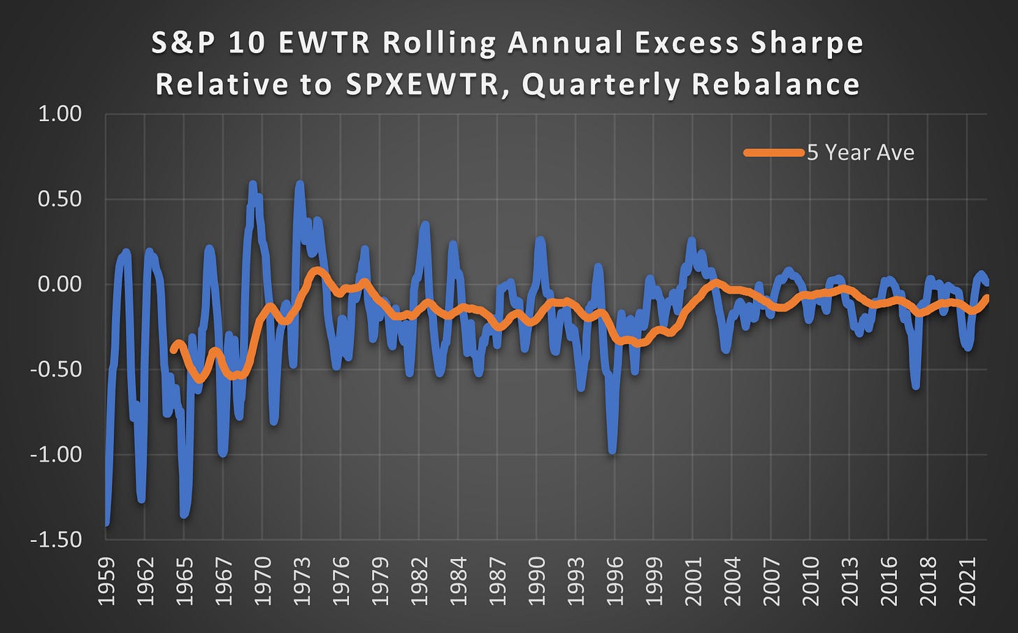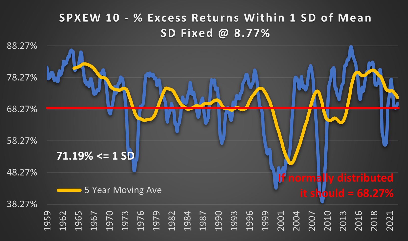 (Above) This is the probability distribution of excess returns for the S&P 10 EWTR rebalanced quarterly, 1957 - 2023. The Standard Deviation (SD) of 8.77% means that in a normal distribution, roughly 68.2% of the time, through pure luck you can expect outcomes +/- 8.77% relative to the benchmark in any given year. The X-Axis covers 3 SD.