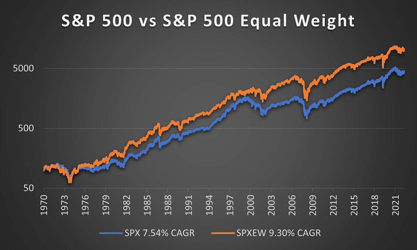The S&P 500 Equal Weight Index (SPXEW) has achieved a Compound Annual Growth Rate (CAGR) of 9.3% since its inception in 1971, compared to 7.45% for the traditional S&P 500 over the same period. This resulted in 1.76% greater yearly returns simply by avoiding over-concentration in large companies.