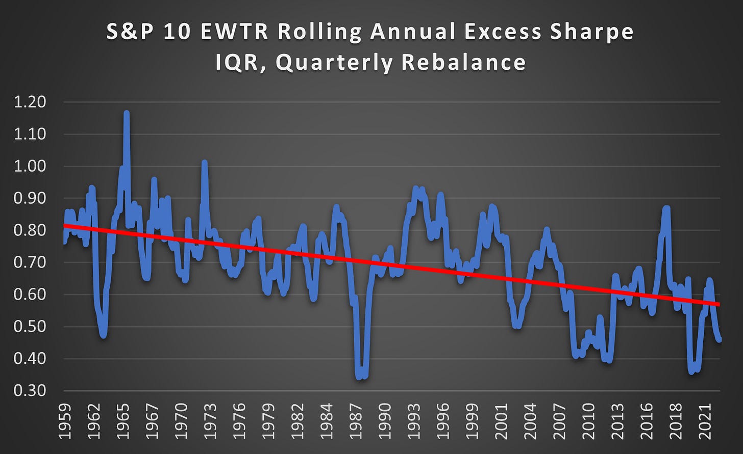 (Above) This is the Inter Quartile Range (IQR) between the Upper and Lower Quartile for the Rolling Annual Excess Sharpe. The range has declined by ~25% showing that the spread of outcomes had declined and not just the average.