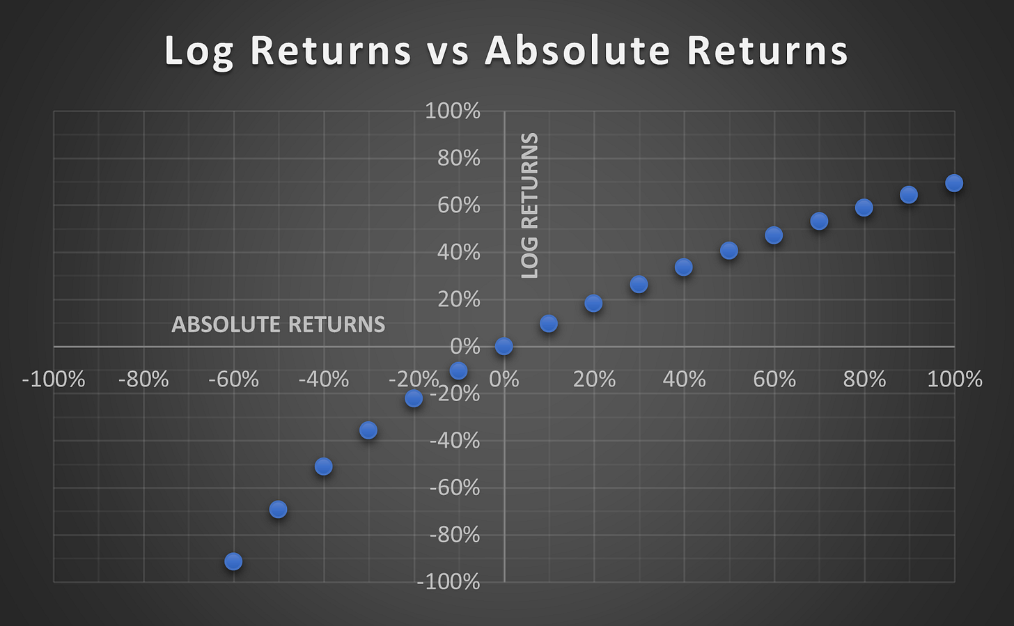 If your portfolio is down by 50% one year and up by 50% the next, what is the value of your portfolio? Your brain wants to say it is back where it started but in reality it is down by 25%. You see, a 50% loss requires a 100% gain to recover. Buy using Log returns, positive and negative outcomes are adjusted so they require the same return to cancel each other out: