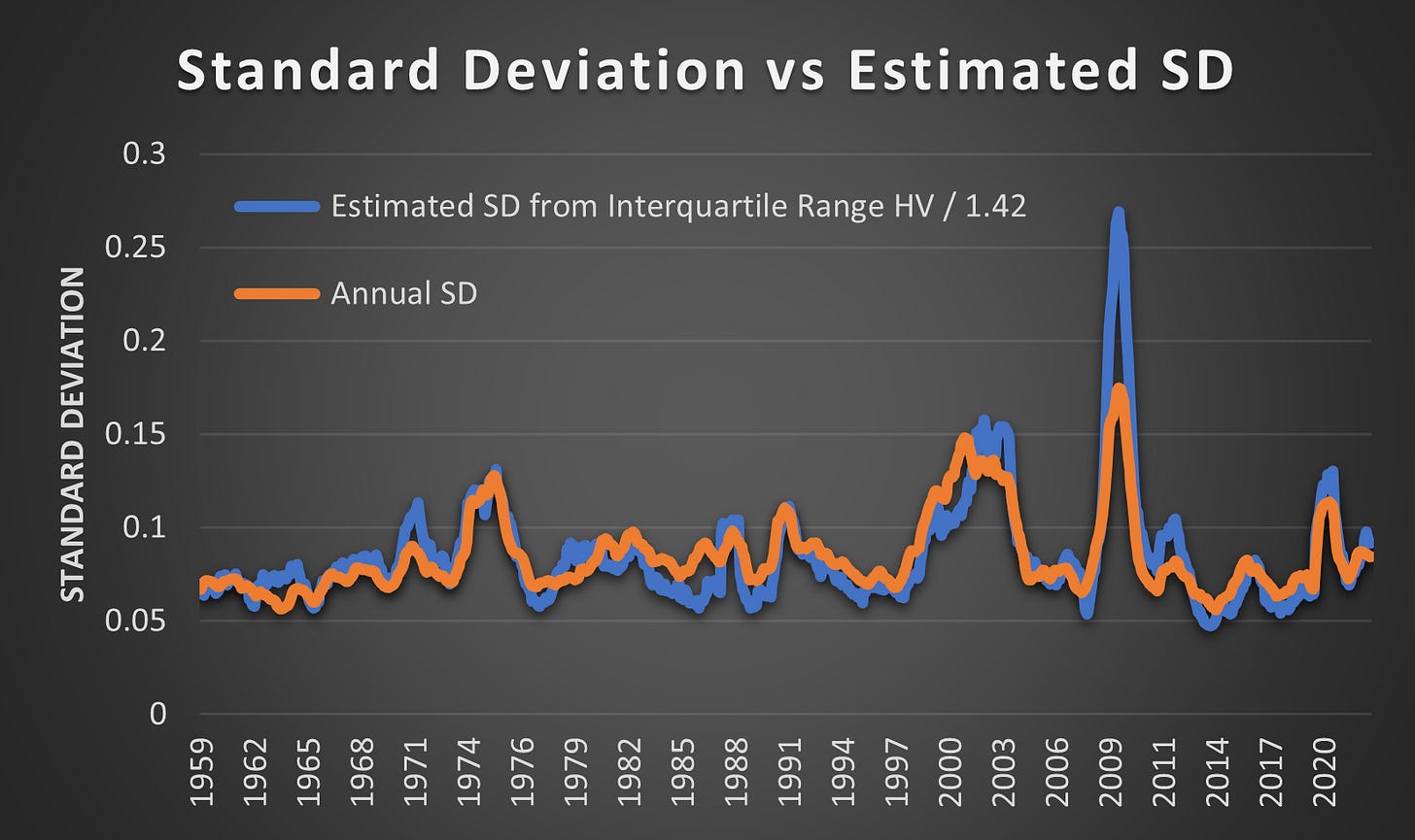 (Above) Dividing the IQR of the Annual Historical Volatility IQR by 1.42 results in a fairly tight match. It was only in 2009 that the estimated SD significantly overshot.
