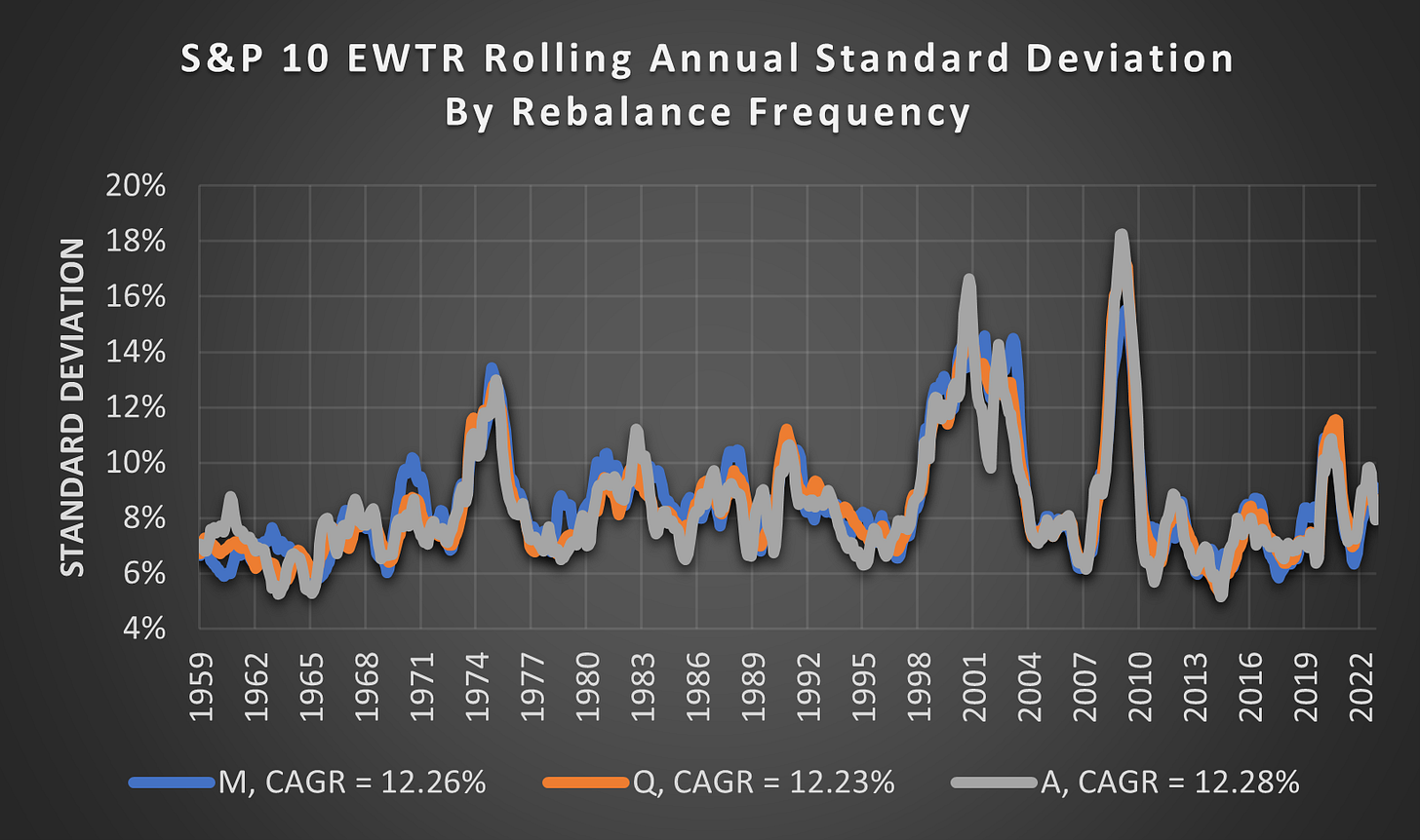 (Above) Even the Rolling Annual Standard Deviation is very similar regardless of the rebalance frequency. Astonishingly, the average CAGR is also only separated by a rounding error @ M = 12.26%, Q = 12.23% and A = 12.28%.