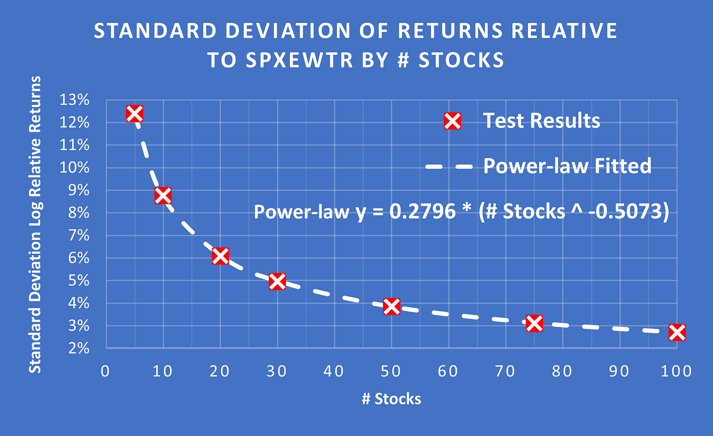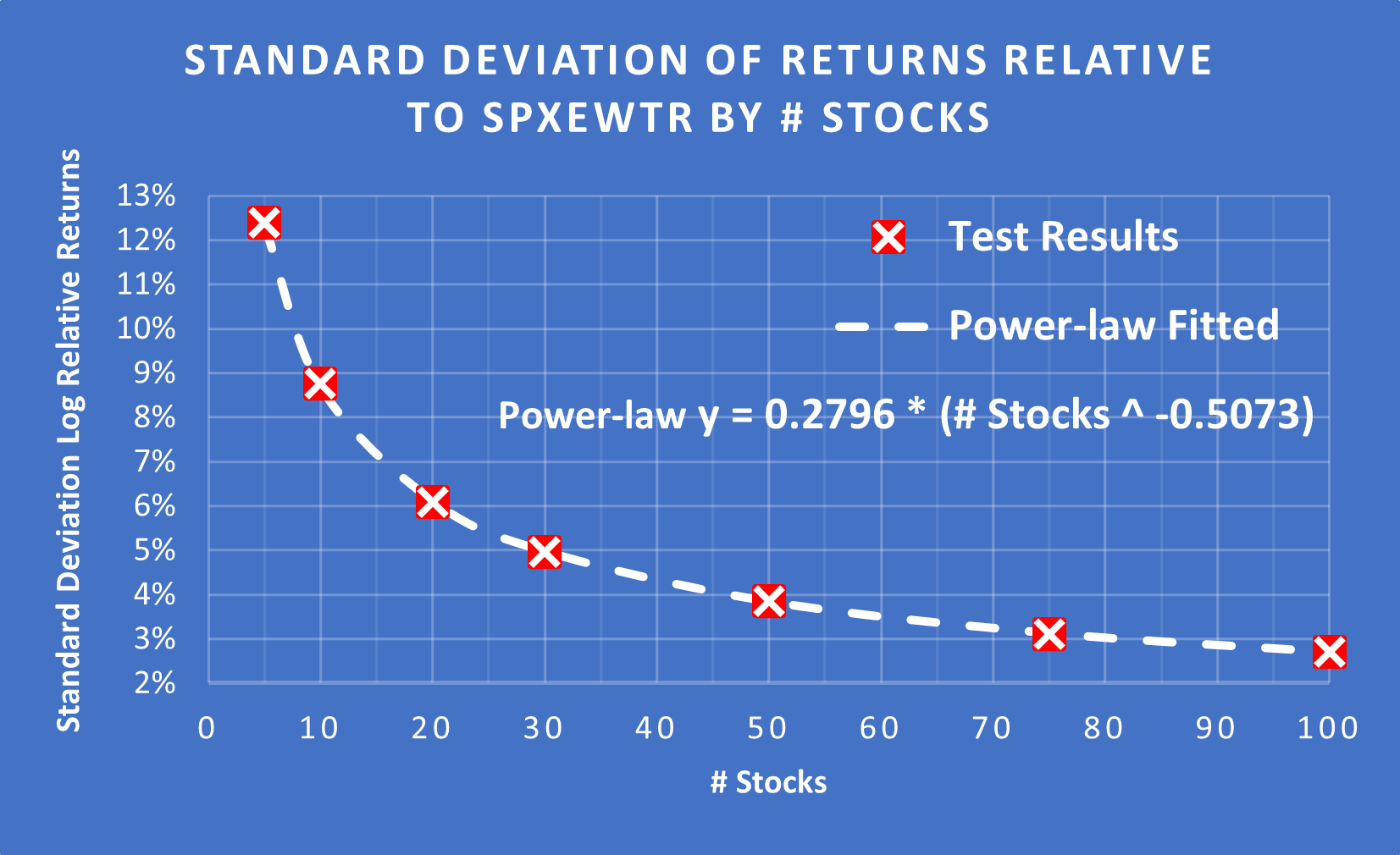 The (Long Term) Standard Deviation of excess returns is a function of the # of stocks in a portfolio = 0.2796 * (# Stocks ^ -0.5073).