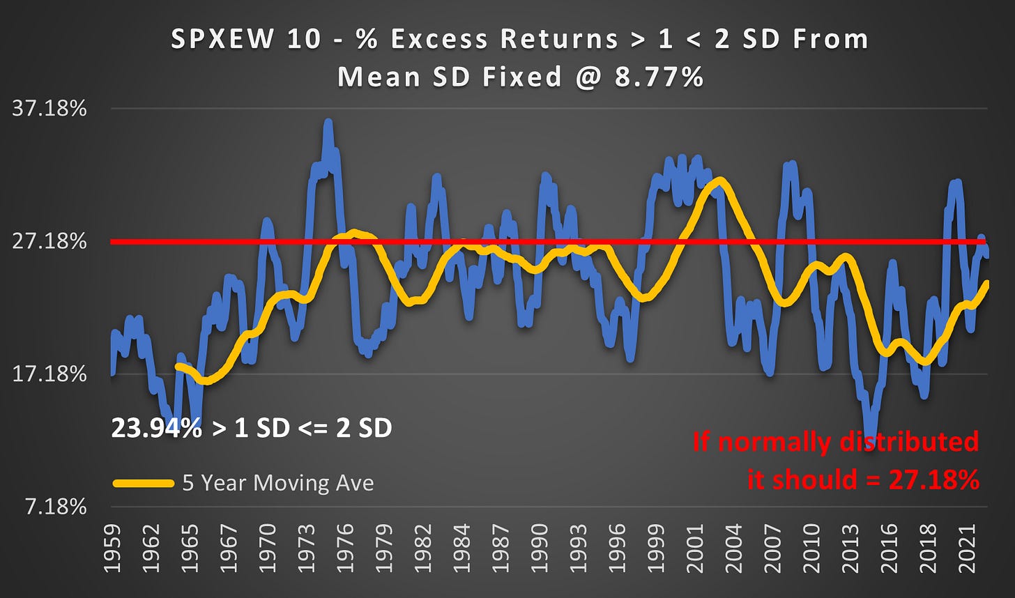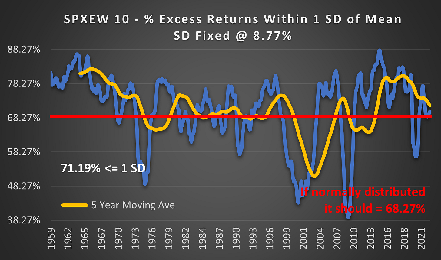 (Above) Using a constant SD @ 8.77 (the SD for the entire period 1959 - 2023), over the long term, the outcomes within 1 SD are only slightly more peaked than a Normal Distribution @ 71.19%. But the range from year to year is 38 - 88%. This makes financial markets notoriously difficult to model.