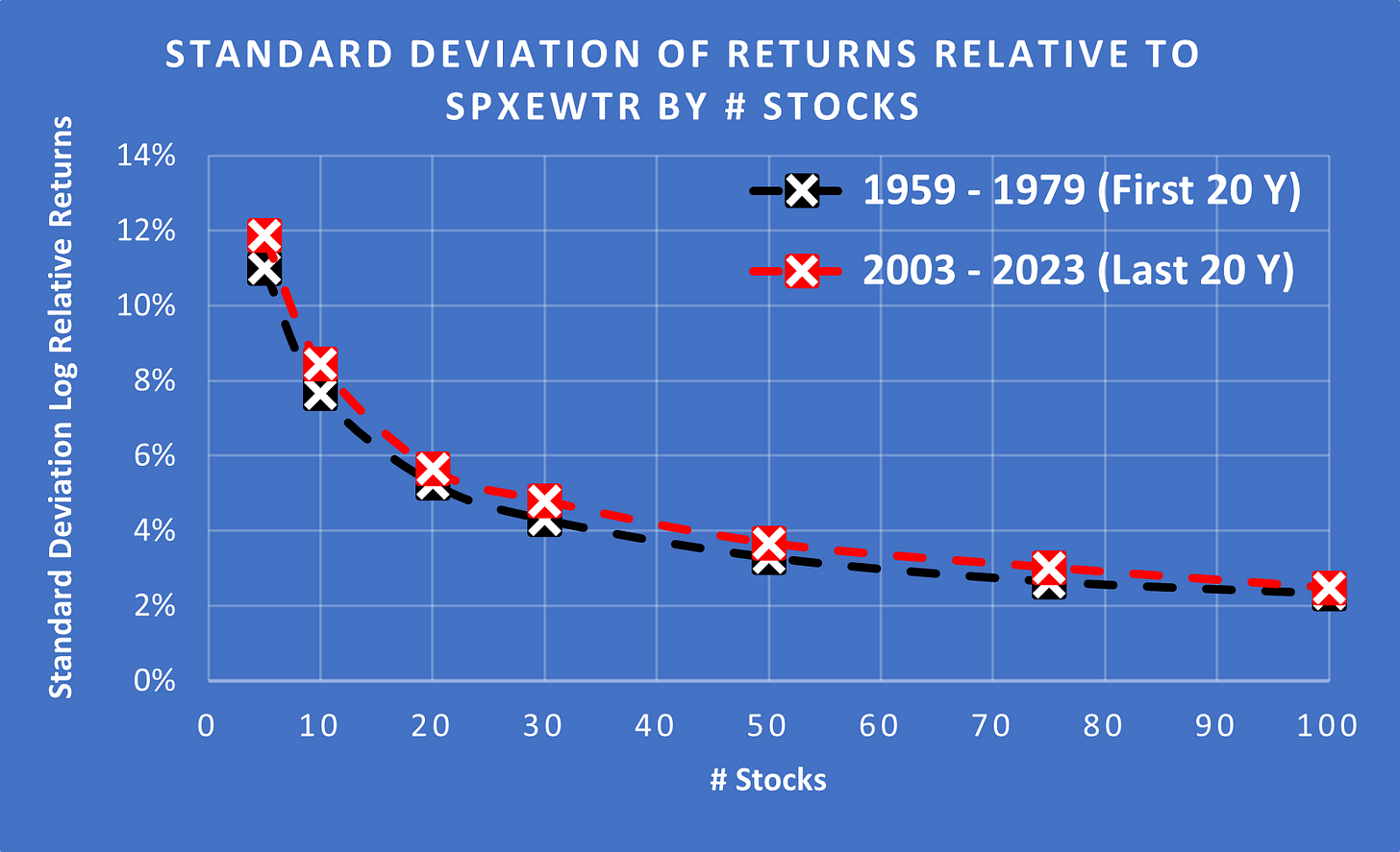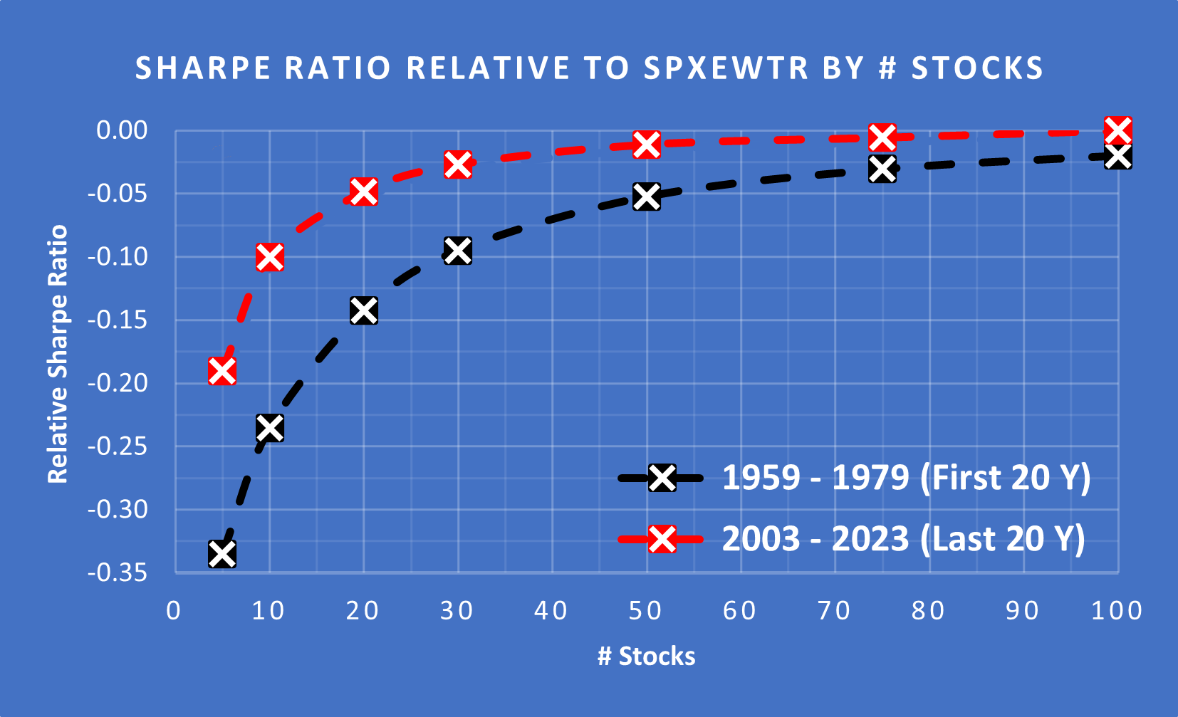 (Above) Earlier in this article we looked at how the Standard Deviation during the first 20 years and the last 20 years had remained very consistent. In contrast, the Excess Sharpe has improved dramatically. Today, you get the same risk-adjusted returns from a portfolio of 30 stocks (from the S&P 500 picked at random) as you did from ~85 stocks in the 60s and 70s.