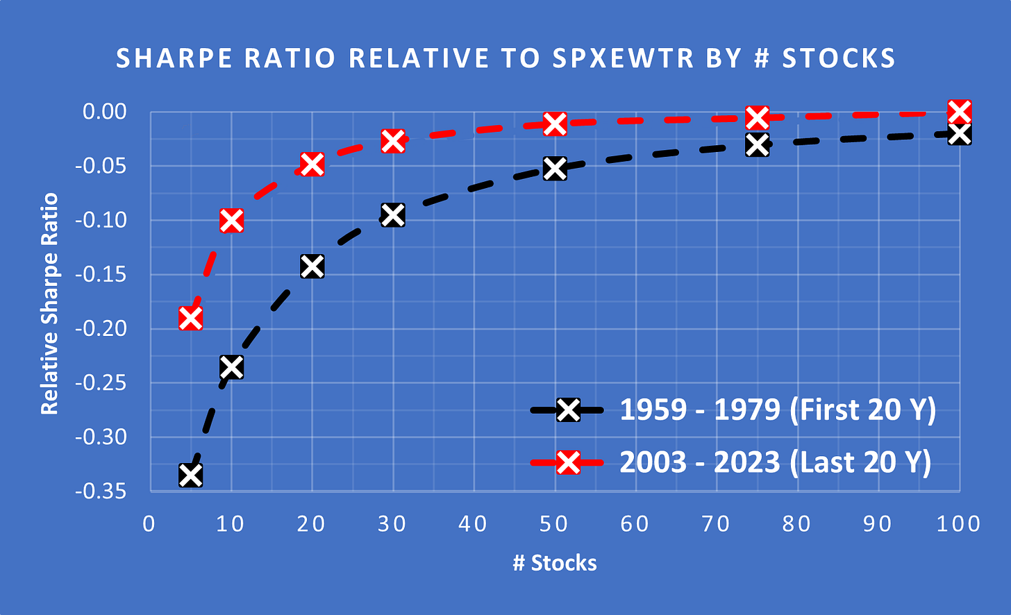 The relative shape ratio has declined significantly over time. You get the same risk-adjusted returns today (2024) with ~30 stocks as you used to get with ~85 stocks in the 1960s.