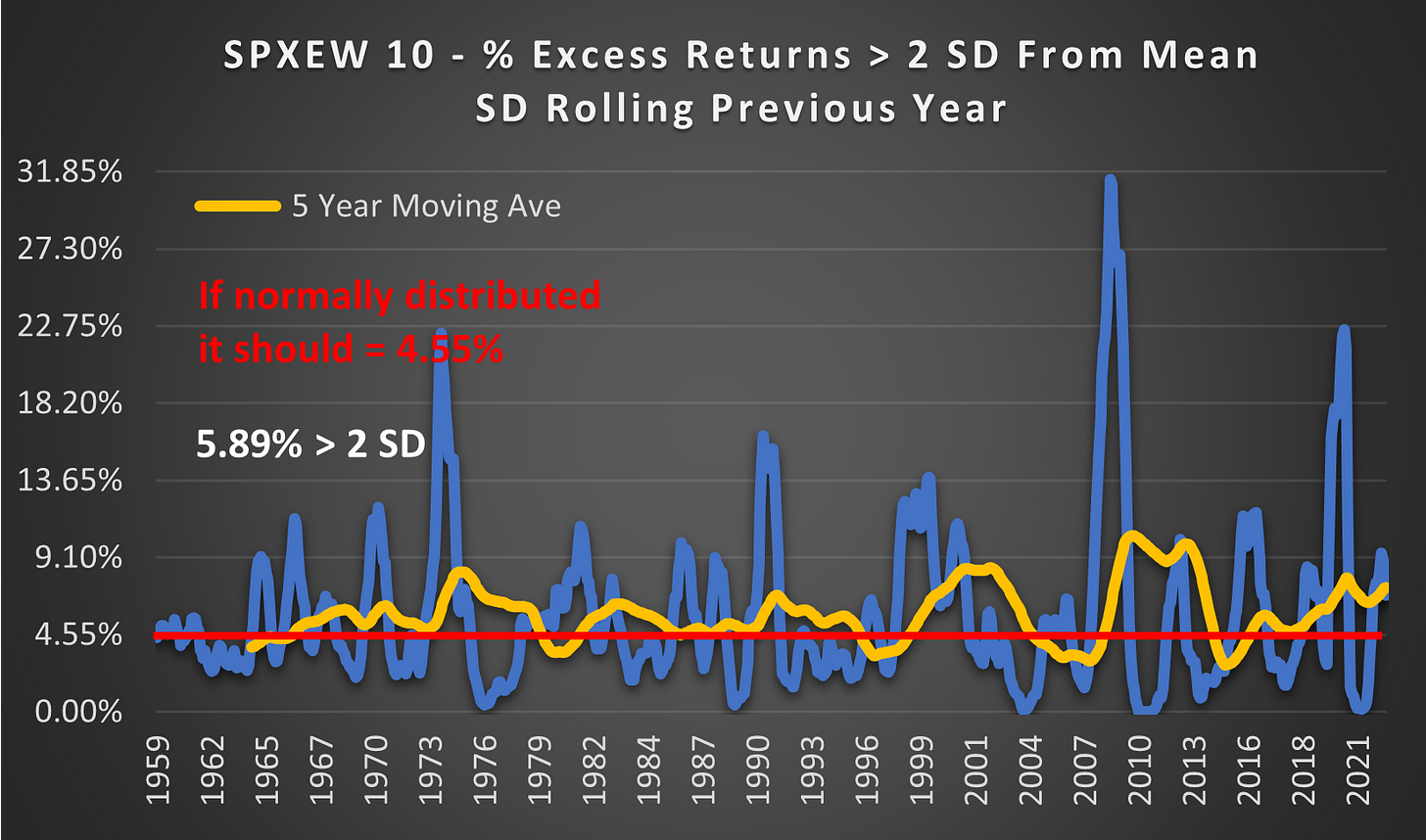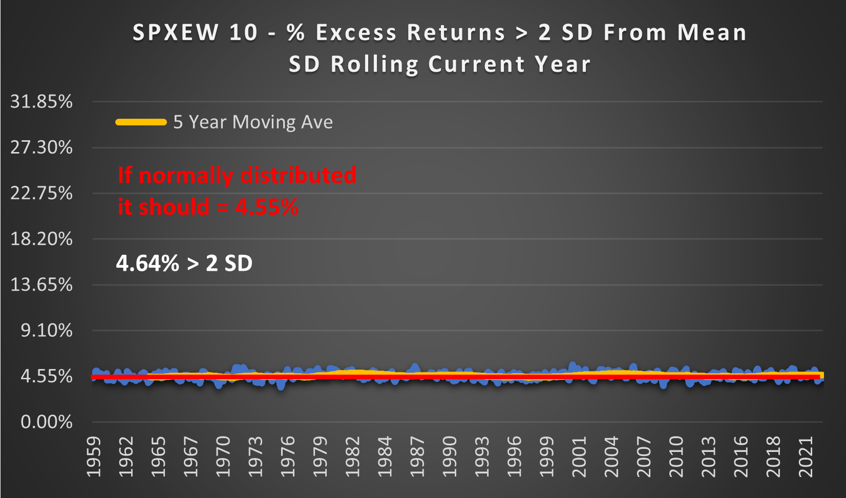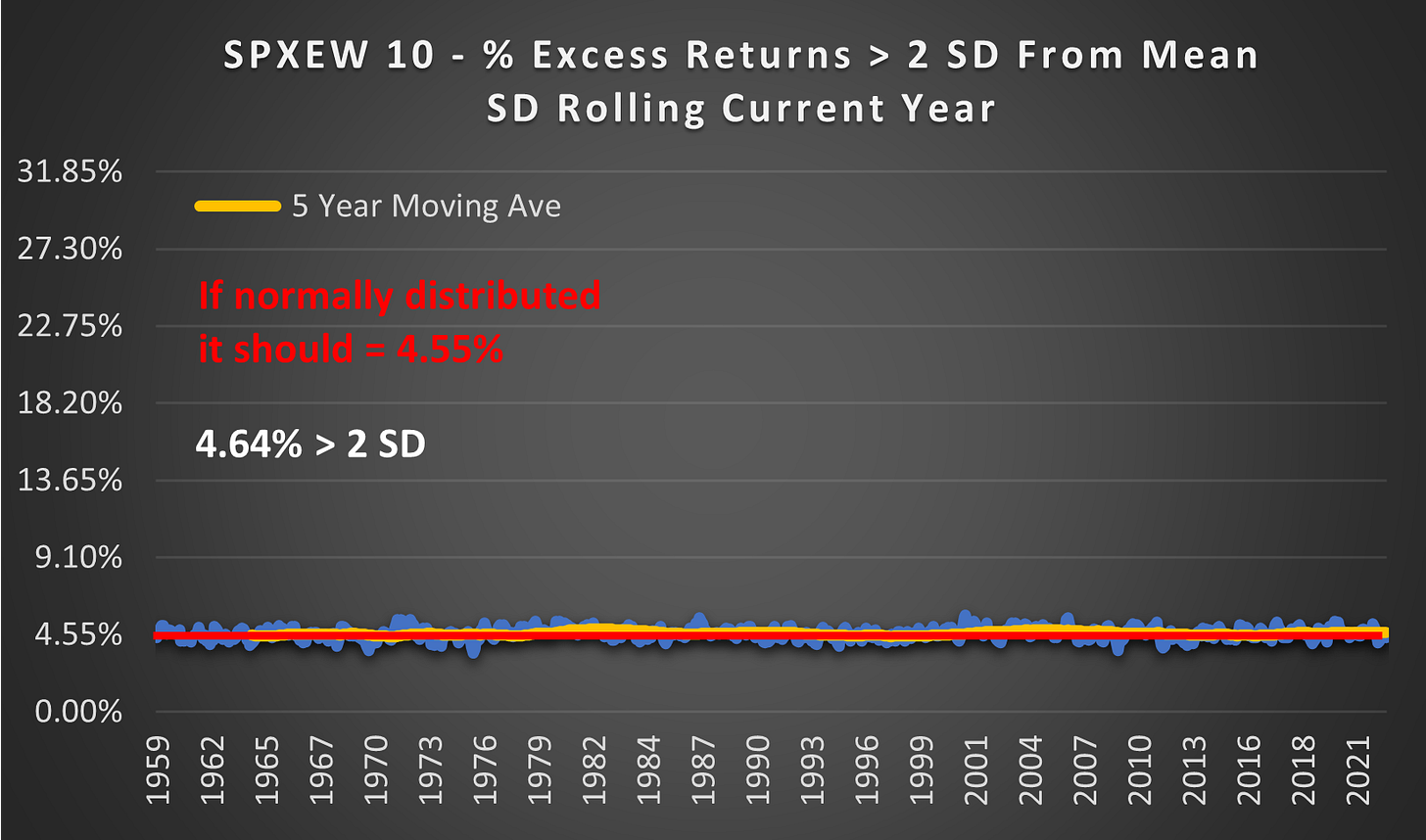 The range of Annual Standard Deviation for Excess Returns for SPXEW 10 (so far) is 6.61% (1964) to 16.49% (2009).