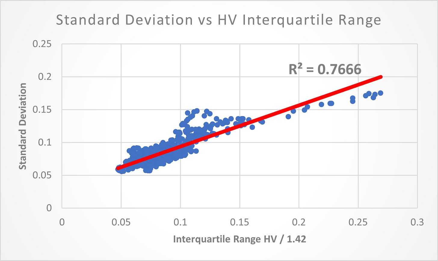 (Above) 76.66% of the Standard Deviation can be explained by the IQR of Historical Volatility.
