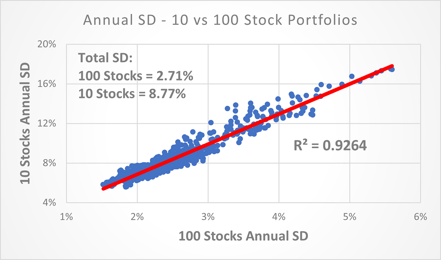 (Above) The R² for the Annual SD between the 10 stock vs. 100 stock portfolios was 0.9264. Meaning that ~92.64% of the annual variability in the SD of the 10-stock portfolios can be explained by the variability in the SD of the 100-stock portfolios. The actual R² is likely even higher since I only ran 100 simulations for the 100-stock portfolios vs 1,000 for the 10-stock portfolios.