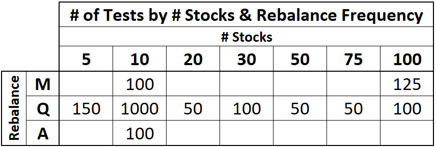 Rebalance Frequency = Stocks randomly selected Monthly (M), Quarterly (Q) or Annually (A).